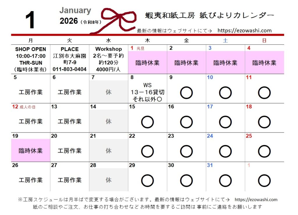 〇急きょ予定が変わるときがあります。ウェブサイトで最新の営業カレンダーをご確認いただくか工房にお問合せ下さい。
